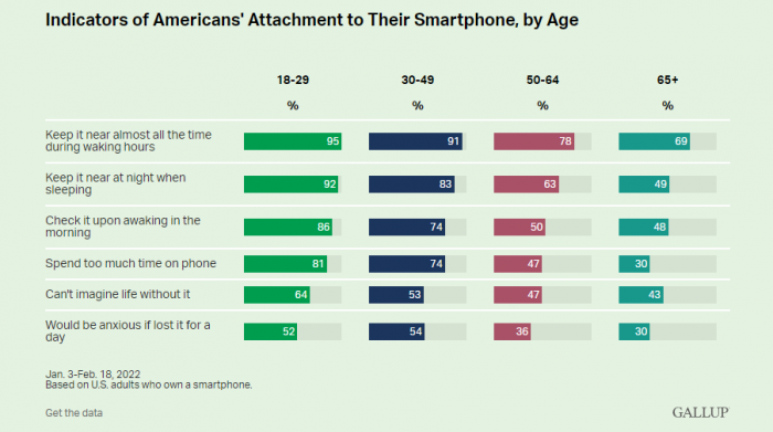 与认为自己花太多时间在手机上的情况一样,美国人关于他们对手机的依恋与年龄高度相关。50岁以下的成年人比50岁以上的人更有可能说他们24小时都带着手机,一觉醒来就看手机,并说如果他们失去手机一天,他们会很焦虑。在无法想象没有手机的生活方面,各年龄组之间的分歧较小。只有不到一半的老年人这样说,而30至49岁的人中有53%,18至29岁的人中有64%。