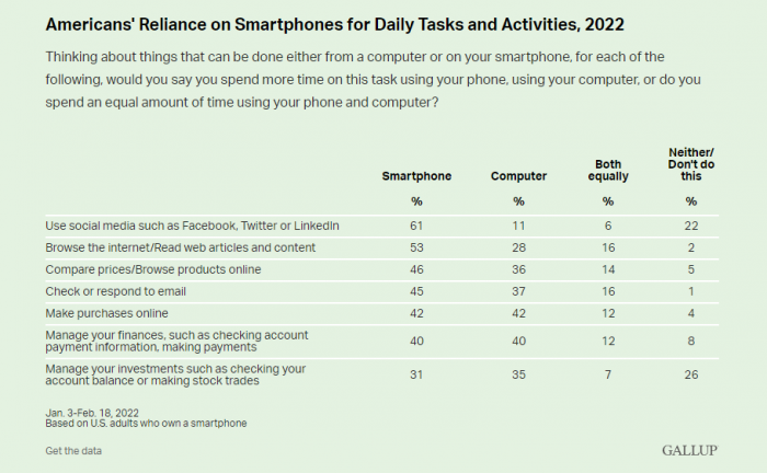 如果根据每项任务依赖智能手机的2022年百分比进行排名,检查社交媒体和浏览互联网位居榜首,大多数美国人更倾向于依赖智能手机,依赖电脑的人相对较少。虽然不是大多数,但更多的人依靠智能手机而不是电脑进行网上购物和收发电子邮件。相比之下,选择智能手机的人数与选择电脑进行网上购物、管理财务和网上投资的人数相当。