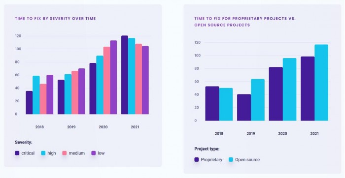 该研究声称,一个应用程序开发项目平均有 49 个漏洞和 80 个直接依赖项。此外,修复开源项目漏洞所需的时间也在稳步增加。早在 2018 年,修复安全漏洞平均需要 49 天。2021年,开发一个补丁大约需要 110 天。