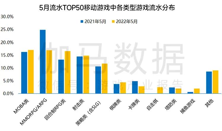 流水TOP50游戏类型分布:MOBA类、回合制RPG类等类型流水份额增加