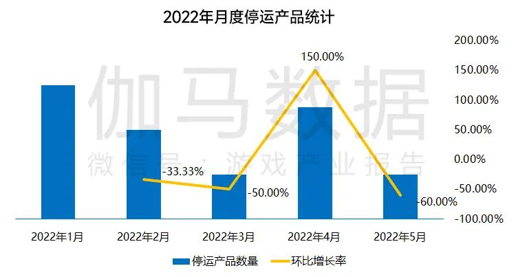 2022年5月,移动游戏产品停运数量较上月明显减少,环比减少60%。停运产品运营时长均超过3年。