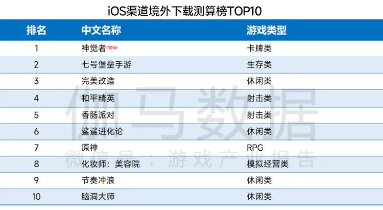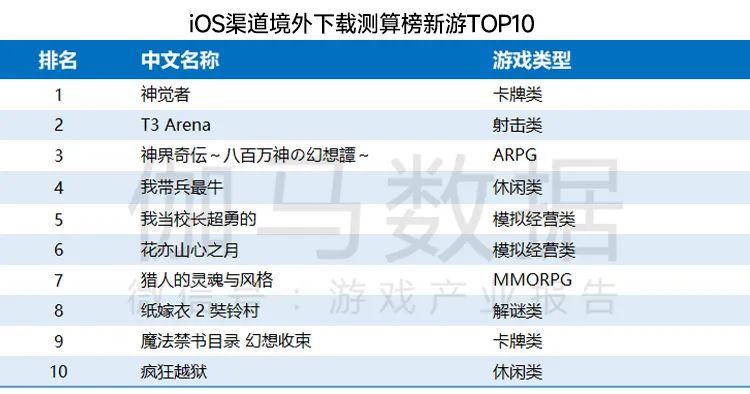 iOS渠道境外下载测算榜新游TOP10:游戏类型呈现多样化