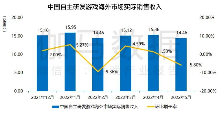 2022年5月,中国自主研发游戏海外市场实际销售收入为14.46亿美元,环比下降5.80%,下滑的主要原因是部分头部产品流水下滑。