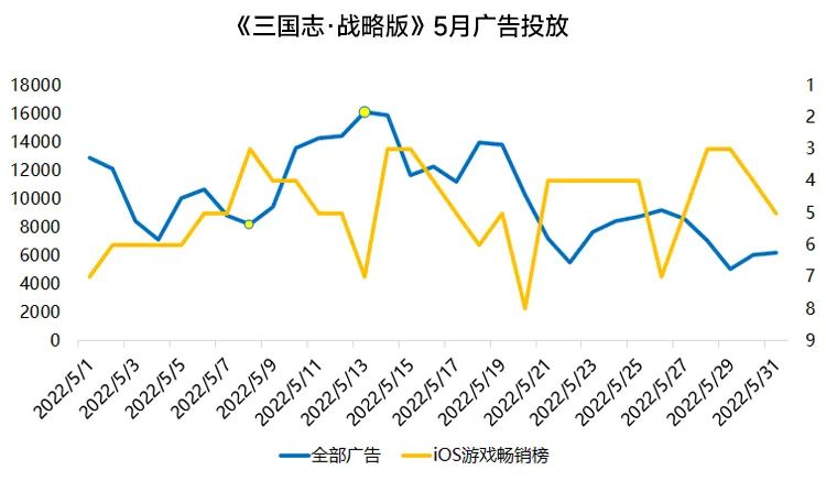 2022年5月,《三国志·战略版》广告投放量环比增长13.27%,位于AppGrowing5月游戏广告投放榜第2名。5月8日其微博官宣5月13日将与奥运冠军任子威联动进行《三国志·战略版》的直播首秀,并在后续的宣传中曝光新玩法——3V3竞速抢地赛,这也是本次直播的主要内容,并于5月8日和14日在iOS畅销榜上达到TOP3 ,广告投放和直播为游戏吸引用户并带来流水增长。