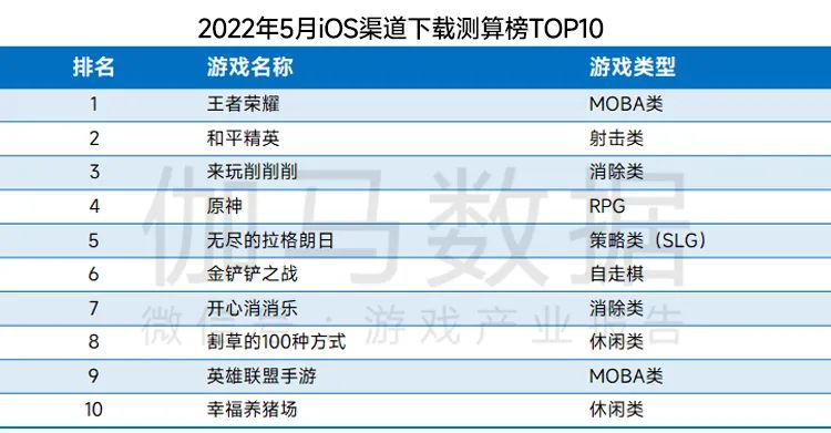 2022年5月,iOS渠道下载测算榜TOP10中,《王者荣耀》登顶,无新游上榜。游戏类型呈多元化,数量达7种,其中MOBA类、消除类和休闲类均有2款产品上榜。《幸福养猪场》上线以来连续两个月上榜。
