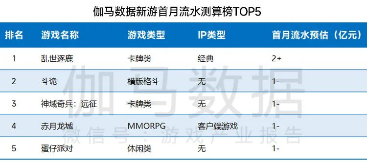 2022年5月,首月流水TOP5新游中,游戏类型呈多样化。《乱世逐鹿》是由攸乐科技研发的三国题材策略卡牌移动游戏,该游戏还邀请了梁朝伟为代言人,上线首日便登顶iOS免费榜,预计首月流水超过2亿元。