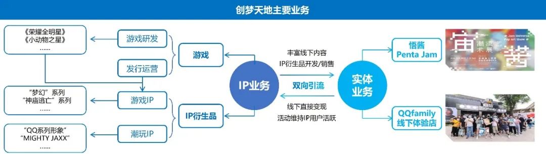 创梦天地拥有多维度的IP矩阵,在游戏侧覆盖了消除、跑酷、MMO等多个品类,同时也在积极培育自有IP,进而打造IP与实体经济结合发展的商业化模式。在IP运营上,创梦天地持续对线上IP与线下实体结合的商业模式进行探索,在传统IP运营中由线下活动维系线上IP用户活跃度思路的基础上,创梦天地将运营重心从线上转移至双端,构建IP业务与线下实体业务相互促进的发展关系。在用户层面可以更为充分的利用IP影响力,实现双向引流;在变现层面则是将线下活动直接变现升级为主要变现途径之一。现阶段,创梦天地旗下QQfamily线下体验店发展迅速,2022年计划新增直营门店40至50家,同时在IP方面也已取得了大量游戏、潮玩IP授权,近期还举办了“宙酱”潮玩展,进而通过对新领域的不断探索,覆盖更多年轻用户群体,同时也为产业衍生发展提供更多思路。