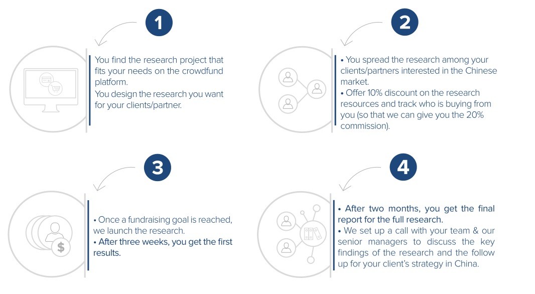 团队将确定这个项目所需的预算,并将研究设计发布在平台上。一旦上线,任何对项目感兴趣的公司都可以投资一部分项目预算(标准份额为1/5),直到预算完成。每家投资的公司都可以为研究添加自己的问题和要求,以更好地满足他们在中国的特定需求和目标。