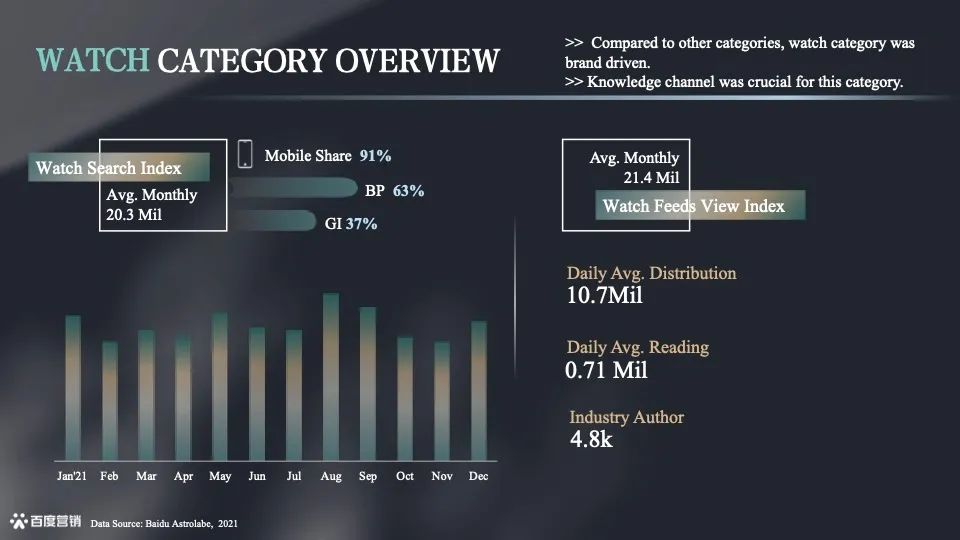 2021年的腕表行业整体表现平稳,流量在节日期间呈现小幅上扬的趋势。在奢侈品四大品类中腕表行业具有着强品牌性、高专业度、重搜索的特点。月均搜索指数总量达到2030万,其中63%为品牌相关的检索内容。月均信息流阅读指数总量达2140万,日均分发指数高达1070万,在百家号平台上腕表行业相关作者近5千名。