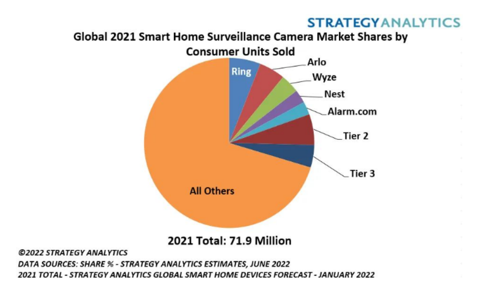 近日,据Strategy Analytics近期发布的研究报告《智能家居监控摄像头全球市场份额- 2022年6月》指出,2021年,亚马逊Ring继续保持全球监控摄像头市场份额第一位置。