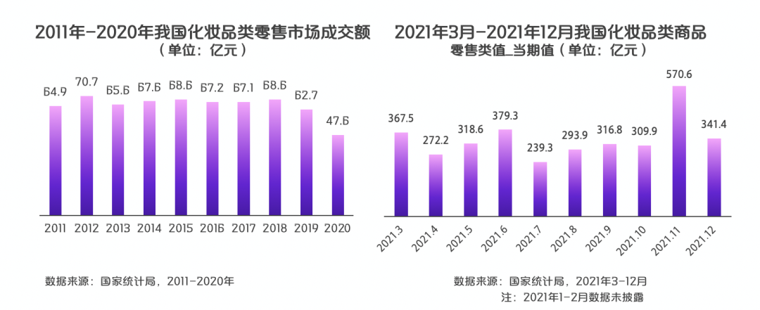总体来看,美妆产品始终是线上电商销售的重要组成部分,而购物节的线上销量也对整个美妆市场有着举足轻重的影响。根据国家统计局数据显示,2021 年全年中国化妆品类零售额累计值达到 4026 亿元,同比增长 18.4%。其中,618 所在的 6 月和双十一所在的 11 月为全年零售额最高的两个月,合计占比 23.6%,两大电商节引爆了全年美妆产品的消费活力。