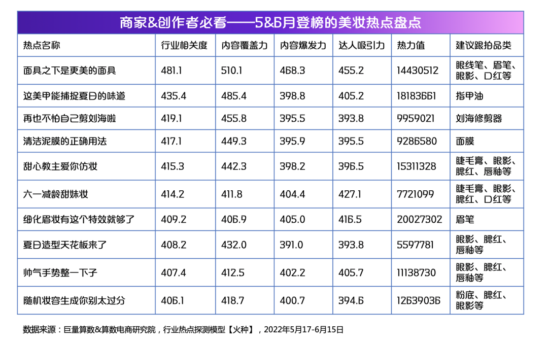 6 月初,巨量算数 & 算数电商研究院推出了全新研究 IP【趋势雷达】。作为趋势雷达研究 IP 之「行业趋势」的第一篇,本篇美妆种草看点从新热点、新成分、新品类等角度呈现美妆行业近来的市场变化,帮助美妆行业从业者及时洞察行业风向,紧跟行业热点,研发新品,打造爆品!