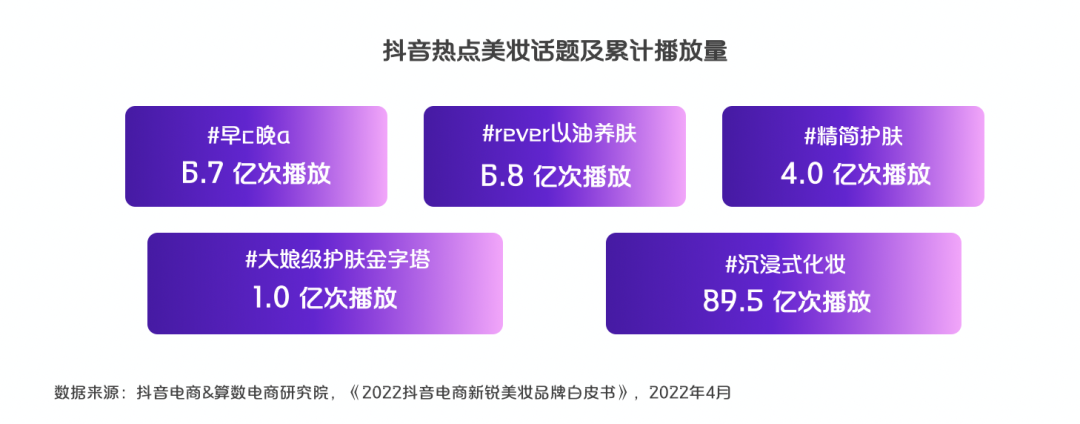 例如在抖音热点美妆话题中,# 大娘级护肤金字塔 话题创建于 2021 年 11 月,在达人骆王宇的推动下,截至 2022 年 4 月,播放量便突破 1.0 亿次;再如 2021 年上半年,# 沉浸式化妆 话题在抖音中新奇,吸引了蔡文玉、小来爱耍赖、微辣阿弯等众多美妆达人参与,话题播放量累计超过 89.5 亿次;