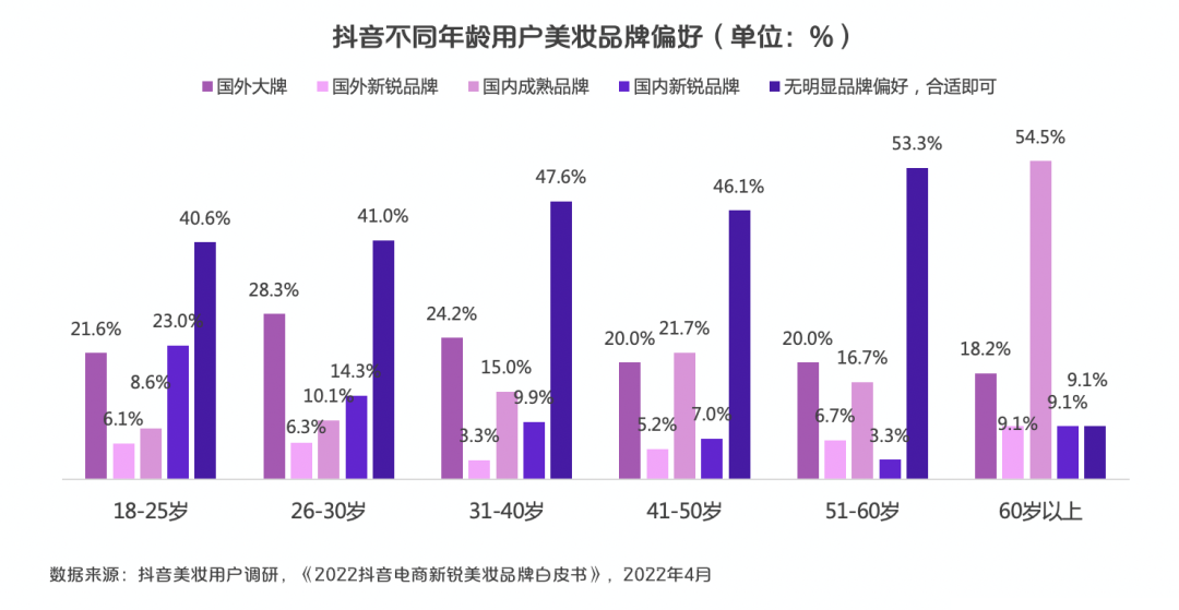 根据《2022 抖音电商新锐美妆品牌白皮书》(以下简称报告)的调研数据,在抖音的美妆兴趣用户中,超过 30% 用户更加倾向于新锐品牌。同时,年轻用户对新锐品牌接受度更高,18-25 岁年轻用户对国内新锐 品牌接受度最高,远高于国外新锐品牌。