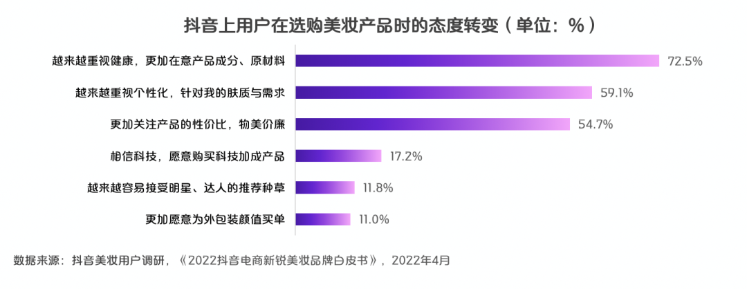 根据《报告》调研数据,72.5% 的抖音美妆用户更加注重成分、原材料,59.1% 的抖音美妆用户越来越重视个性化需求。另外,各个美妆品类在基础功效上都陆续添加其他成分,逐步丰富产品功能,例如保湿功能已经渗入唇釉、隔离等品类中。