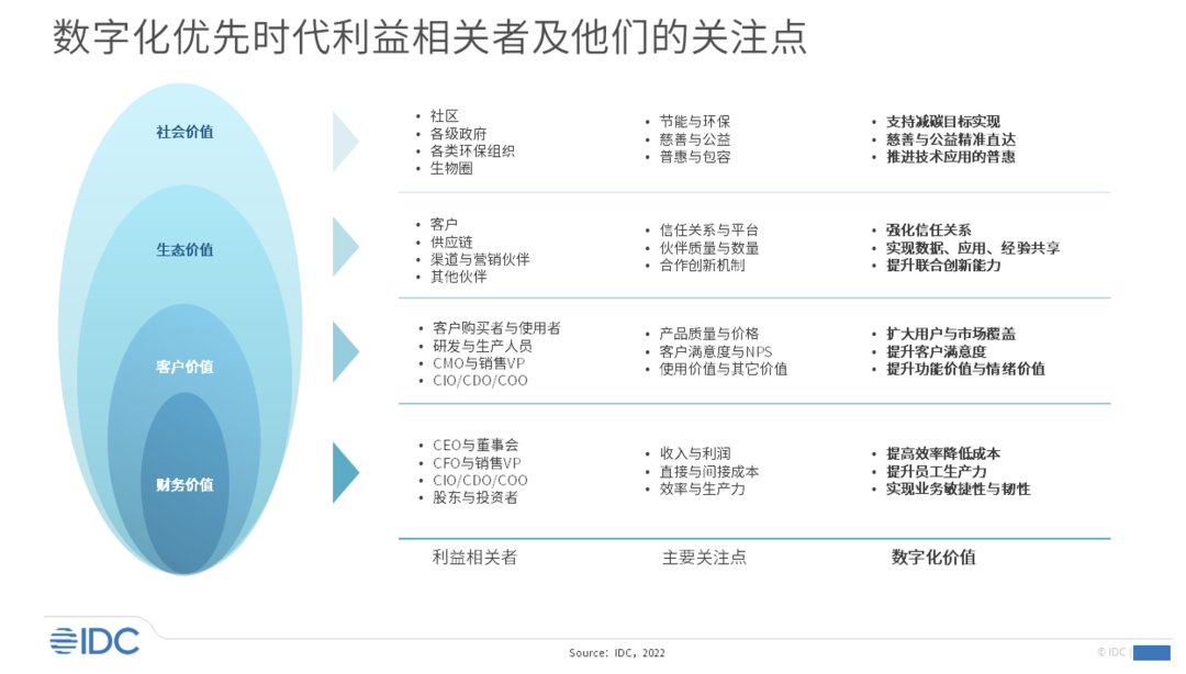 数字化优先不是单纯的技术或商业模式,而是企业的一种远景,一种对数字技术价值的认可、期待和行动。数字化优先时代要求规模化创新可持续化、情景化、实时化。数字化优先也在重新定义数字化的价值:财务价值、客户价值、生态价值、社会价值。在行业用户支出最高的 Top 20 战略应用场景领域,制造行业相关的战略应用场景占主导地位、以客户为中心一直是刚需、全渠道商务渗透所有行业、基于软件的数字化创新很关键、高速连接与未来工作越来越重要。