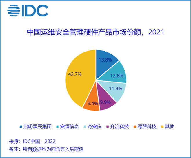 IDC 于 2022 年 6 月正式发布了针对中国运维安全管理硬件产品的市场份额研究报告,即:《中国运维安全管理硬件市场份额,2021:技术融合,场景适配》(# CHC48499422)。IDC 在报告中针对 2021 年中国运维安全管理硬件产品市场的规模、增长速度、主要玩家、市场与技术的发展趋势等内容进行了详细研究。报告数据显示,我国对新冠肺炎疫情的有效防控,帮助企业尽快实现了复工复产,企业信息化建设的步伐明显加快,同步提升了对网络安全产品和服务的需求,促进了中国整体网络安全市场快速增长。2021 年中国运维安全管理产品硬件产品的市场规模达到 1.6 亿美元,同比增长 18.9%,整体市场呈现平稳增长的态势,市场竞争主要以 “综合型安全厂商 + 专业技术领域安全厂商” 格局为主,头部玩家包括启明星辰集团、安恒信息、奇安信、齐治科技、绿盟科技等厂商。具体情况详见下图: