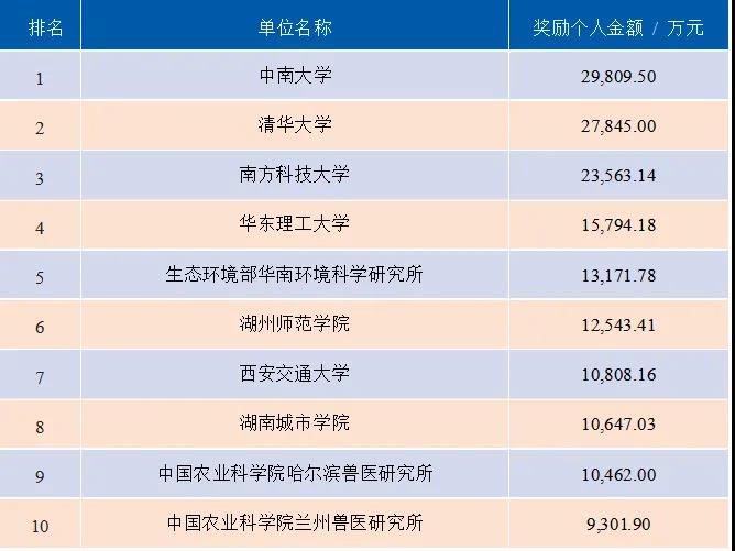 2019年高校院所奖励个人现金和股份总金额前10名