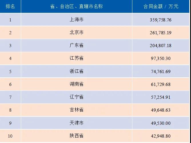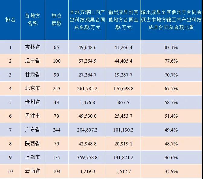 2019年各地方辖区内产出科技成果输出至其他地方合同金额占合同总金额比重前10名的相关情况