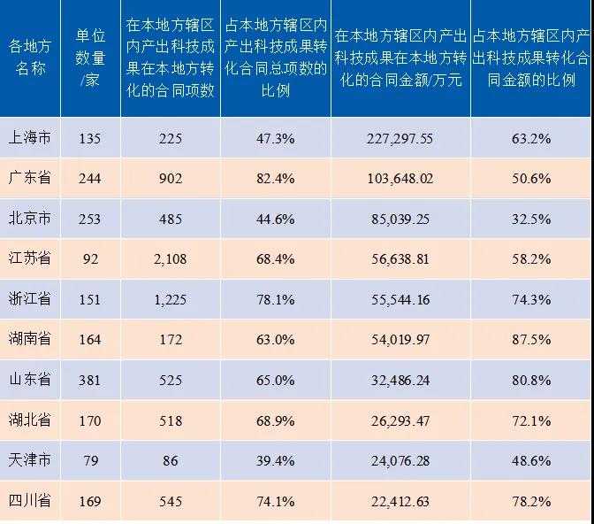 2019年各地方辖区内产出科技成果转化至本地方的合同项数与合同金额前10名情况