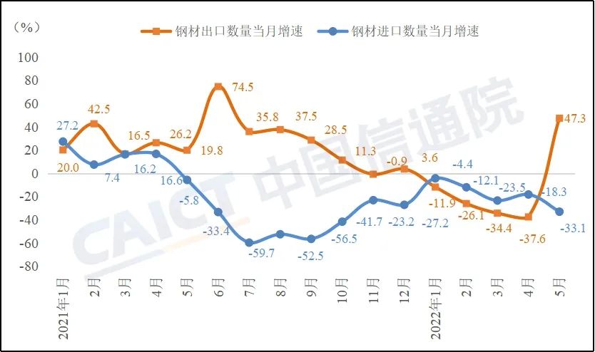 钢材出口增速大幅提升。前5个月,全国累计出口钢材2591.5万吨,同比下降16.2%;进口钢材498万吨,同比下降18.3%;净出口钢材2093.5万吨,同比下降15.7%。分月来看,5月份,我国出口钢材776万吨,同比增长47.3%,月度出口量创自2021年5月以来的新高;进口钢材80.6万吨,同比下降33.1%,进口增速降幅进一步扩大。