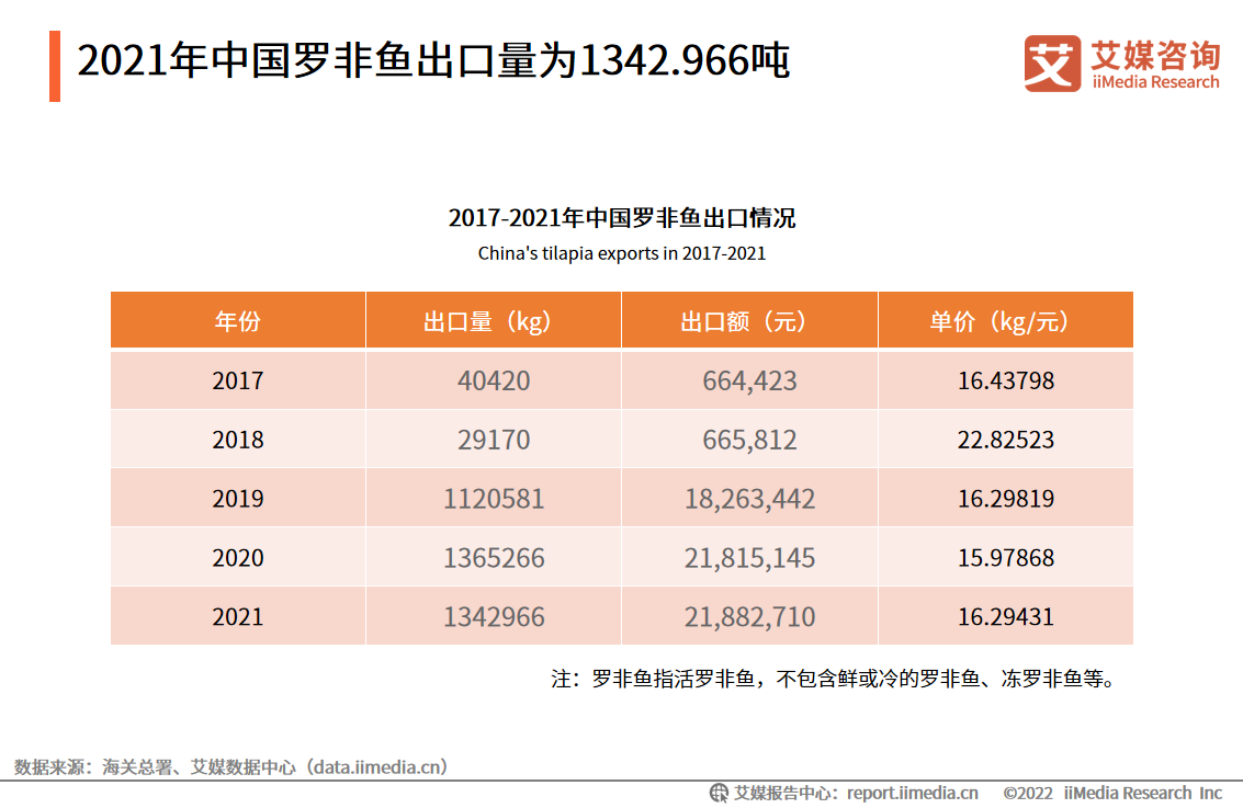 中国作为全球罗非鱼产量最高的国家之一,其产出量能够满足国内的需求。数据显示,2021年,中国罗非鱼出口量为1342.966吨,同比下降1.6%,平均单价较往年有所上涨,为每公斤16.3元。