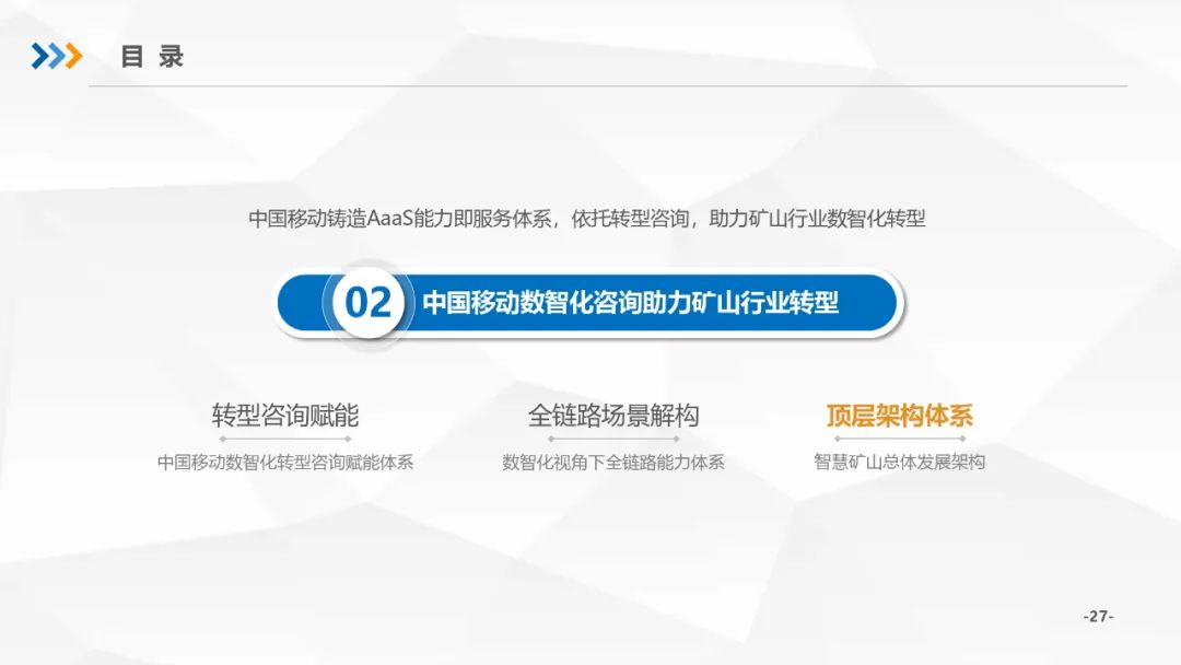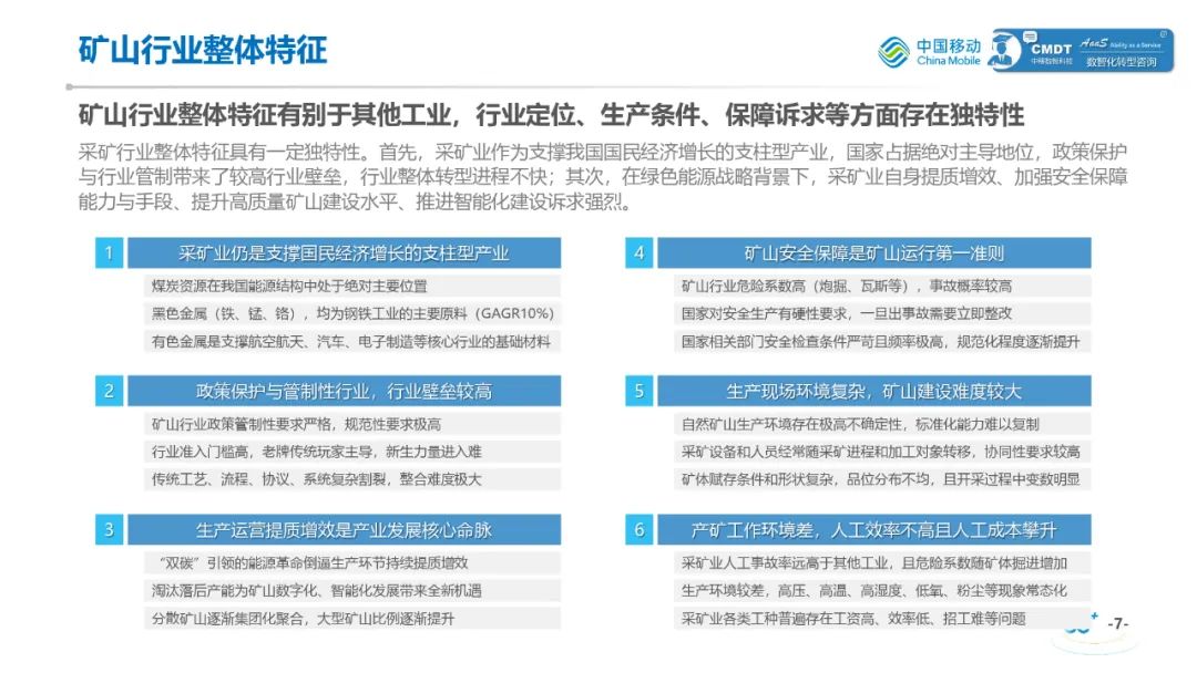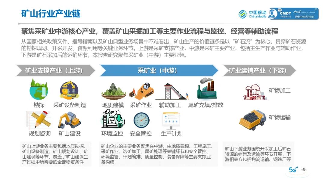 中国移动:矿山行业数智化转型咨询服务白皮书 更多阅读:2017年中国移动终端质量报告中国移动:中国5G产业发展与投资报告中国移动:2015年4月咪咕游戏数据报告财富中文:2013年中国企业社会责任排行榜中国移动:2019年智能硬件质量报告(第二期)中国移动:2018年智能硬件质量报告(第一期)中国移动&NGMN:6G驱动力与愿景白皮书中国移动:5G无线技术演进白皮书中国移动:消费升级背景下的会员体系发展模式研究中国移动:2020年一二线城市银发族数字化生活洞察报告中国移动:2025年Q3营收2509亿元,同比增长2.5%中国移动:2025年上半年营运收入5438亿元,净利润842亿元创业邦&中国移动:2024人形机器人研究报告(附下载)中国信通院:2024年1至7月三家基础电信企业的移动数据流量业务收入为3817亿元中国移动财报:2024上半年中国移动净利润达802亿元 每天赚4.4亿元