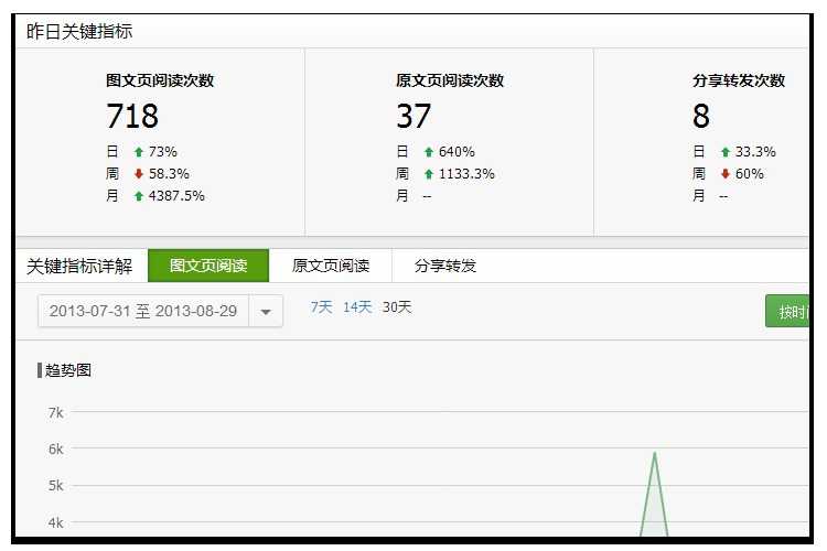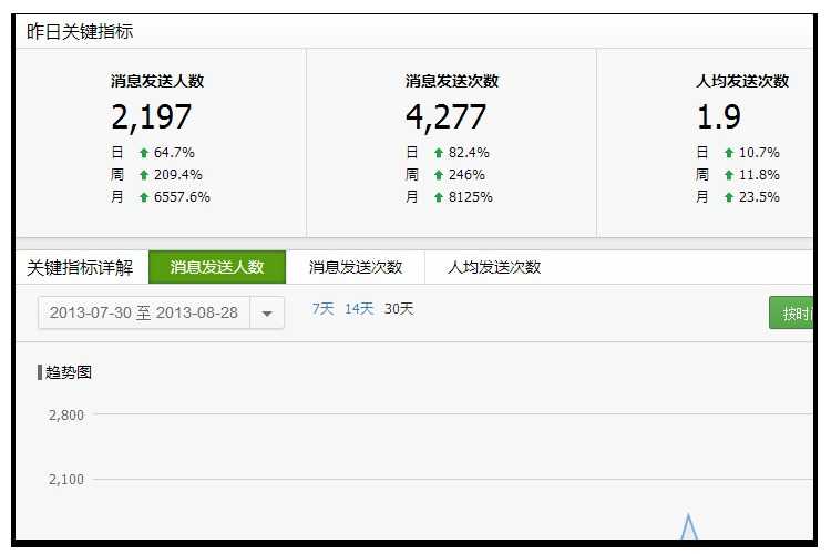 微信公众平台增加数据统计功能 1、用户管理分析 查看任意时间段内用户数的增长、取消关注和用户属性等统计。 2、群发图文消息分析 查看任意时间段内图文消息群发效果的统计,包括送达人数,阅读人数和转发人数等分析。 3、用户消息分析 查看针对用户发送的消息的统计,包括消息发送人数,次数等分析。 4、接口调用分析 成为开发者的公众号,可以查看接口调用的相关统计。 注:所有数据统计从2013年7月1日起始,每日数据一般在第二天上午进行更新。 更多阅读:电子商务研究中心:到2014年7月我国微信公众帐号超过580万数字之旅的时代启幕——空间计算中电联:2021中国电力行业年度发展乐普医疗新冠病毒抗体胶体金法检测试剂盒、红外测温仪等产品已供往数十国家Demand Gen :制造商将数字转换扩展到销售和营销报告前程无忧:2021年Q1集成电路/半导体市场供需报告CCFA:2019年中国超市百强万博:中国市场经济地位报告工信部:2020年1-11月软件和信息技术服务业主要指标分省表物联云仓:2020年9月中国通用仓储市场动态报告新纪录10000+ 中国汽车单月投诉创10年新高MedTrend医趋势:继口罩、呼吸机之后,新冠物资短缺剑指透析产品!腾讯互娱:2017年Q3 AI 行业热度观察校管家:2023年8月线下培训教育行业运营数据报告普洛斯:物流园规划设计的发展趋势