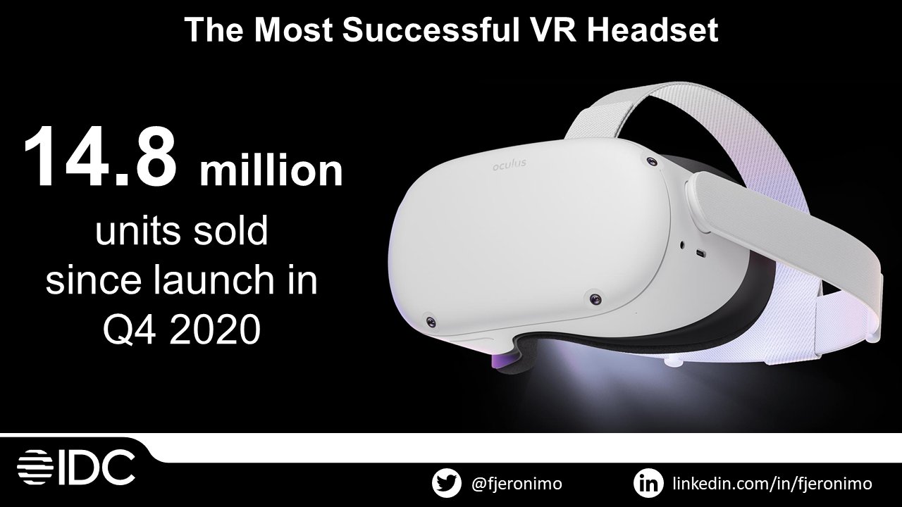 虽然动作缓慢,但虚拟现实市场在过去几年中的确一直在稳步增长。而在所有竞争者中,对增长贡献最大的可能就是Meta了,也就是Oculus。其当前的旗舰头显Meta Quest 2一直保持了这种趋势。