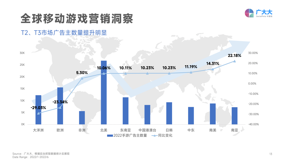 2022 年上半年总计移动游戏投放素材量共 15.8 M 组,同比下降近 30%,而从广告主数量来看,数量跟去年同期相比变化并不大,约为 45.1K 名。从地区维度来看,除大洋洲和欧洲呈现下降趋势外,其他地区的广告主数量均出现了不同程度的提升,其中 T2、T3 市场广告主数量提升明显。