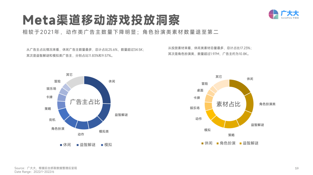 另外,在 Meta 系各个渠道热门投放广告主 TOP 10 榜单中,SLG 和益智解谜手游的占比较高。