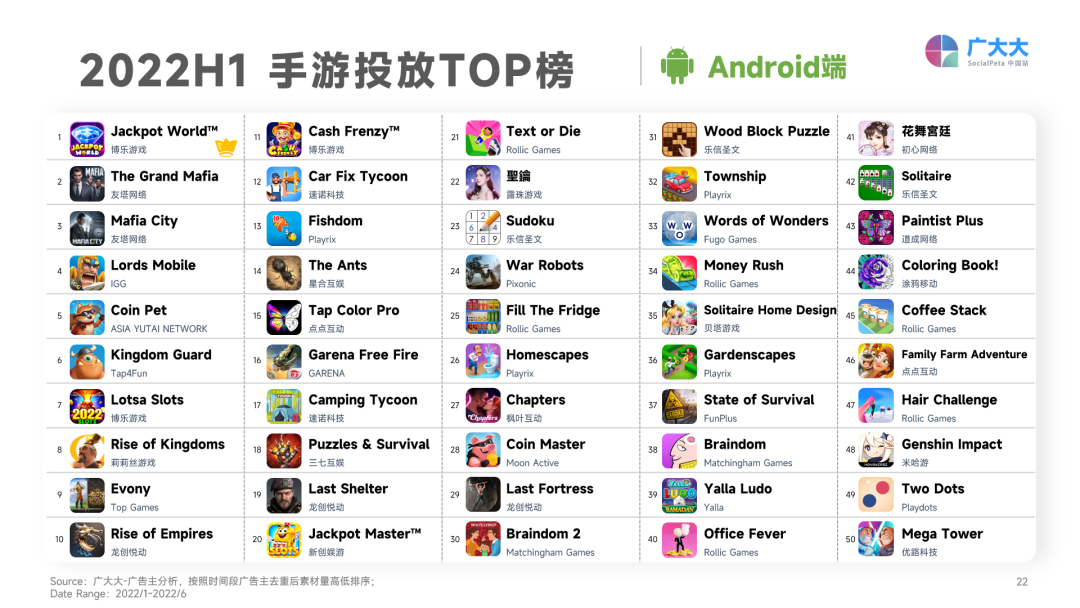 根据广大大的广告主分析以及 APP Intelligence 等功能,我们也整理出 2022 年上半年移动游戏在 iOS 和 Android 系统的投放 TOP50 以及下载、收入 TOP 20 榜单。可以看到,投放 TOP 50 中近 70% 的广告主均为中国出海厂商;在营收维度,米哈游的【Genshin Impact(原神)】、腾讯的【PUBG MOBILE】、Top Games 的【Evony】等也纷纷上榜,表现亮眼。