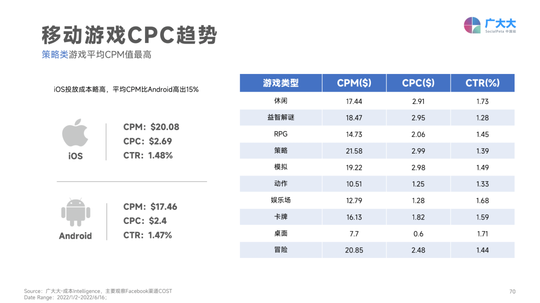 整体来看,移动游戏的投放成本持续攀升,2022 H1 的平均 CPM 达到 $19.31,环比上升 18%;平均 CPC 为 $2.57,环比下降 3%;平均 CTR 为 1.48%,环比上升 7%。