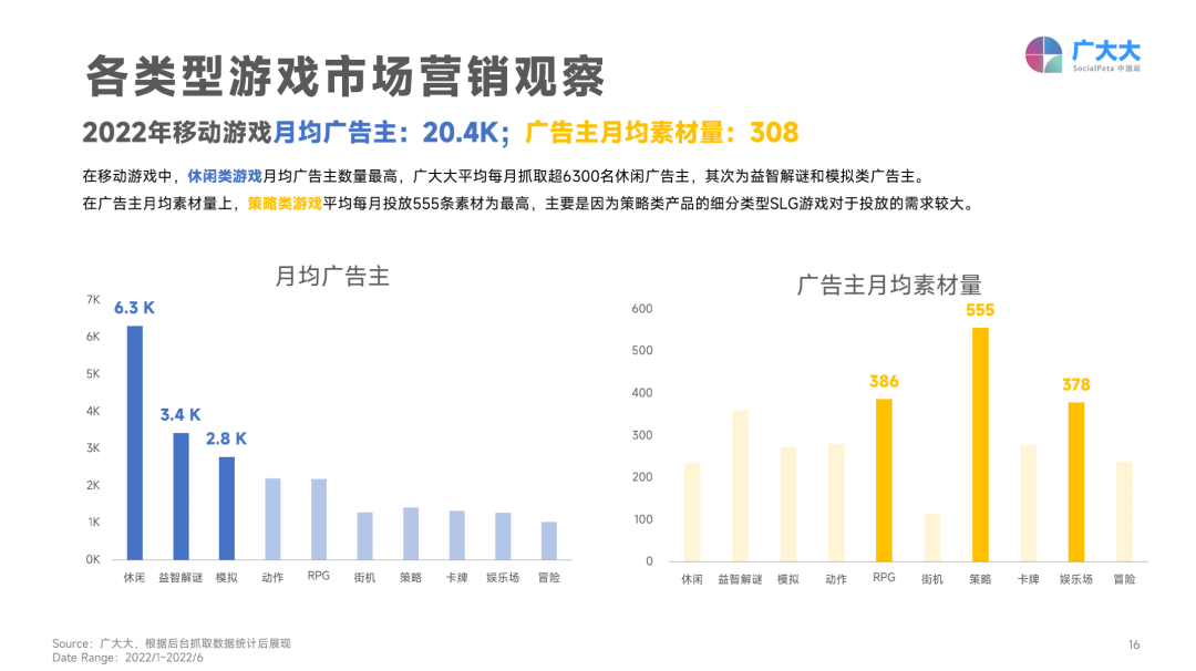从均量来看,2022 年上半年的移动游戏月均广告主为 20.4K 个,广告主月均素材量为 308 条。其中月均广告主数量最高的依然是休闲类手游,广大大平均每月抓取超 6300 名休闲广告主,其次为益智解谜和模拟类广告主。