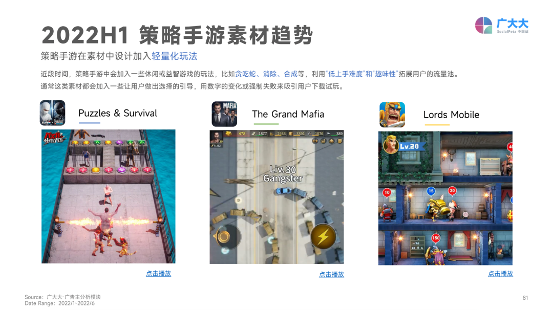 以热门出海赛道之一的策略手游为例,在 2022 年上半年投放的素材中,设计时会加入轻量化玩法,比如:贪吃蛇、消除、合成等,利用 “低上手难度” 和“趣味性”拓展用户的流量池。通常这类素材都会加入让用户做出选择的引导,用数字的变化或强制失败来吸引用户下载试玩。