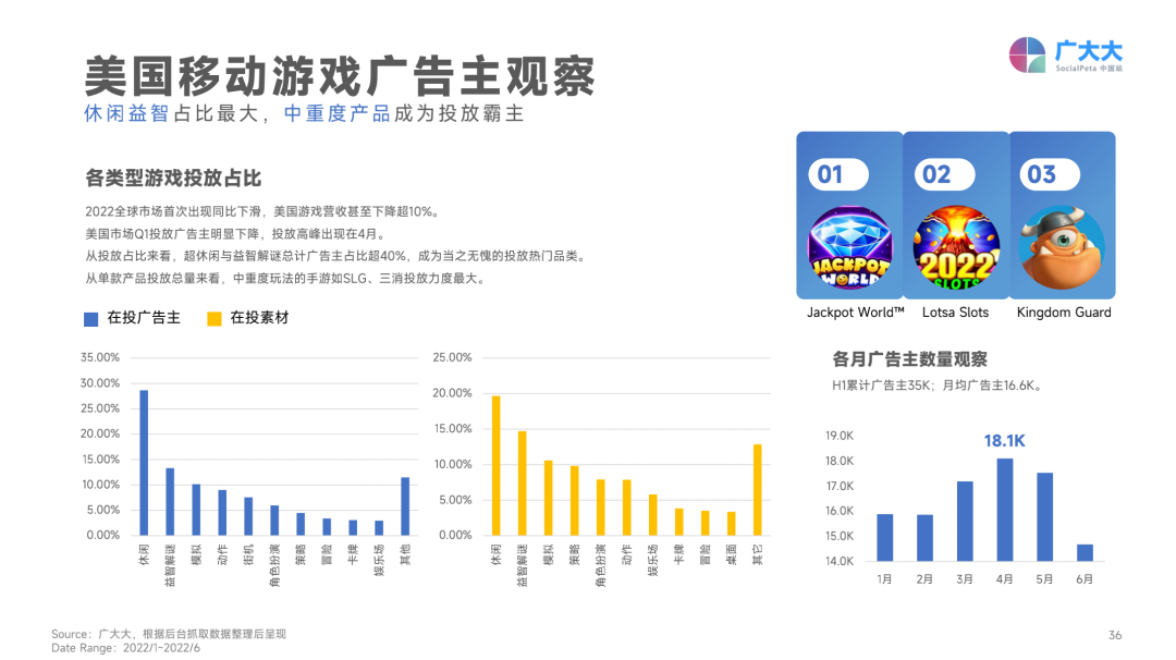 以美国地区为例,该地区的投放占比中,超休闲与益智解谜总计广告主占比最高,超过总量的 40%,是该地区最热门的投放品类;从单款产品的投放总量来看,则属中重度产品的投放力度最大,包括 SLG 和三消玩法。