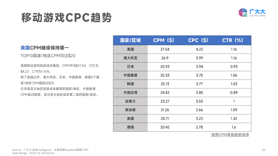 广大大数据研究院对全球移动游戏的投放成本进行了整理,从 CPC、CPM、CTR、CPA、CPI 等多个数据维度洞察全球趋势。