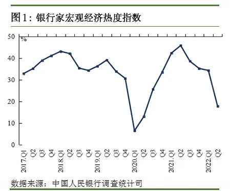 1. 宏观经济热度指数:反映当前宏观经济状况的扩散指数。该指数的计算方法是在全部接受调查的银行家中,先分别计算认为本季经济 “偏热” 和“正常”的占比,再分别赋予权重 1 和 0.5 后求和得出。