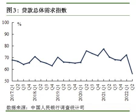 3. 贷款总体需求指数:反映银行家对贷款总体需求情况判断的扩散指数。该指数的计算方法是在全部接受调查的银行家中,先分别计算认为本行本季贷款需求 “增长” 和“基本不变”的占比,再分别赋予权重 1 和 0.5 后求和得出。