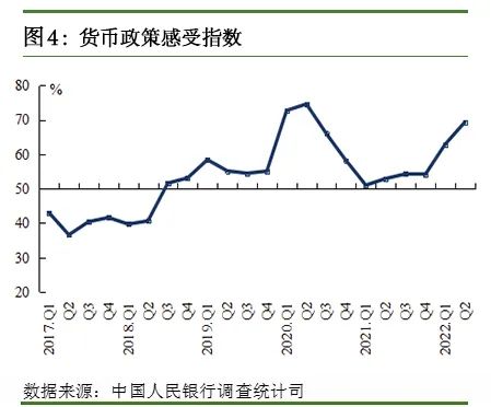 2. 货币政策感受指数:反映银行家对货币政策感受程度的指数。该指数的计算方法是在全部接受调查的银行家中,先分别计算认为本季货币政策 “偏松” 和“适度”的占比,再分别赋予权重 1 和 0.5 后求和得出。