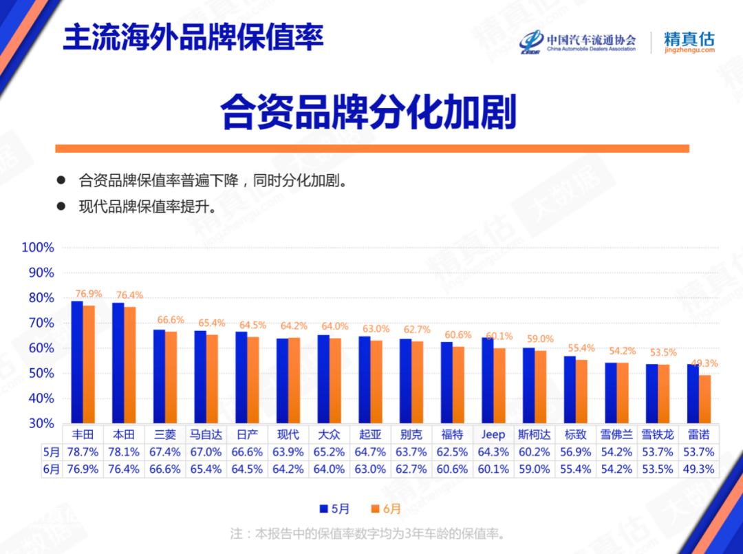 传统合资品牌和市场空间进一步被压缩,其中JEEP、雷诺等品牌处于退市边缘或已经退市,二手车价值大幅下滑。丰田、本田保值率仍然领先,整体分化加剧。