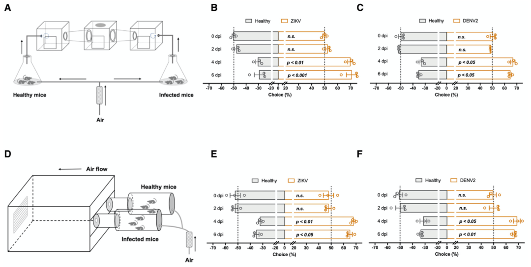 研究的思路倒是不复杂。研究人员首先用寨卡病毒(ZIKV)感染小鼠,然后观察伊蚊(Aedes mosquitoes)是更喜欢感染了寨卡病毒的小鼠,还是没感染的小鼠。