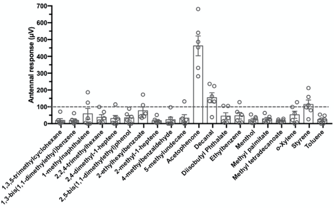 结果发现,登革热患者释放的苯乙酮比健康志愿者高得多。(实际上,研究人员还在所有参与人员的胳肢窝里发现了癸醛、棕榈酸甲酯和苯乙烯等六种挥发性化合物,但是这六种化合物在感染者组和对照组之间没有差异。这再次说明癸醛可能真不是蚊子更爱咬谁的关键。)