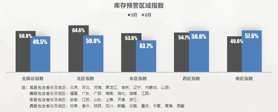 从区域指数情况看:6 月全国总指数为 49.5%,北区指数为 50.8%,东区指数为 43.7%,西区指数为 56.6%,南区指数为 57.6%。政策助力下,北区、东区车市快速恢复,两区库存预警指数进入或接近景气区间;南方大范围迎来持续强降雨,广东、江西等多地暴发洪水,南区库存预警指数上升。