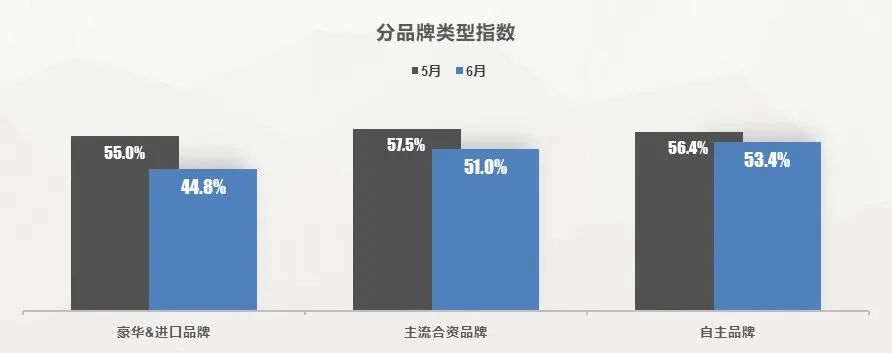 从分品牌类型指数看:6 月进口 & 豪华品牌、主流合资品牌、自主品牌指数环比下降。购置税减半政策惠及大部分合资及少部分豪华品牌汽车,销量整体向好,库存预警指数下降。