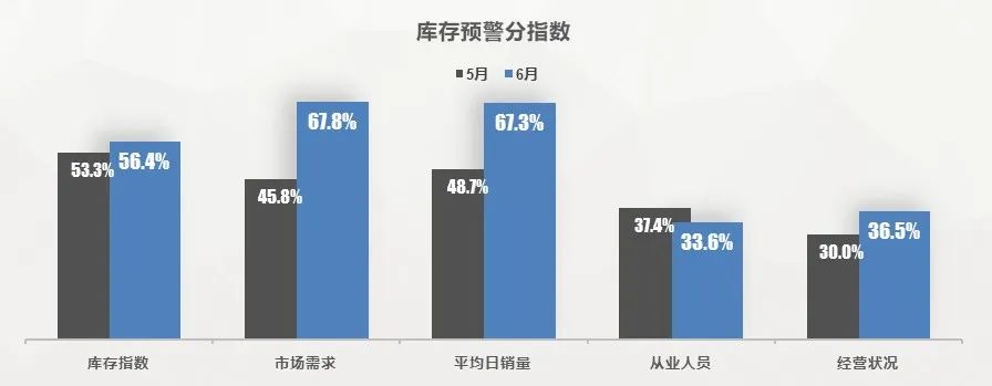 从分指数情况看:6 月库存、市场需求、平均日销量、经营状况指数环比上升,从业人员指数环比下降。密集出台的促消费政策在短期内提升消费信心,经销商客流及成交情况明显好转,经营状况好于上月。