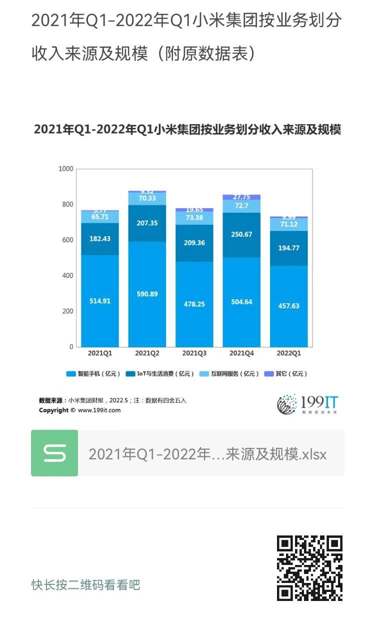2021年Q1-2022年Q1小米集团按业务划分收入来源及规模(附原数据表) ​​​​