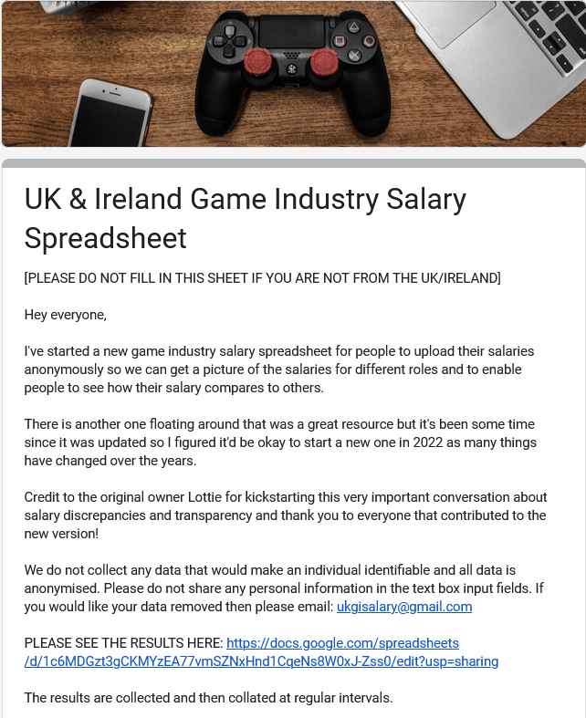 为鼓励英国游戏行业提高薪酬透明度而设立的电子表格公布了不同职位和部门工作人员的平均工资。这项工作由独立工作室 Silent Games 的 Sally Blake,Media Molecule 传播经理 Gemma Cooper 和 Creative England 项目经理 Chris Filip 领导。