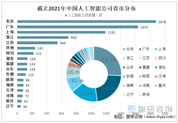 从人工智能公司省市分布来看,截止 2021 年底,中国人工智能公司数量排名前三的省市分别为北京、广东、上海,也是全国人工智能公司数量超过 1000 家的省市,分别有人工智能公司 1878 家、1635 家、1192 家,占比分别为 26%、22%、16%,排名第四的浙江有人工智能公司数量 693 家,较第三的上海少 499 家。