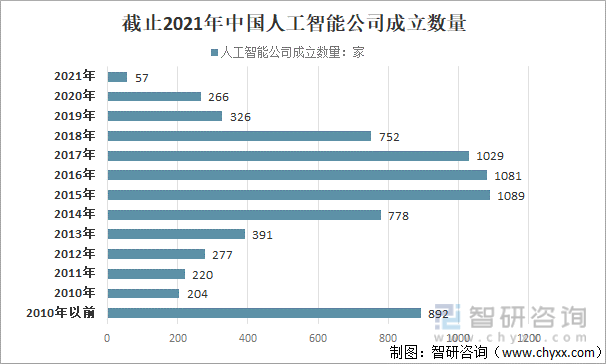 2010 年来,随着科技的进步,国家及相关部门的政策支持,中国的人工智能行业呈高速发展趋势。2015 年,中国人工智能公司成立数量达到巅峰,有 1089 家,近几年,人工智能公司成立数量呈下降趋势,2021 年中国人工智能公司成立数量仅为 57 家。